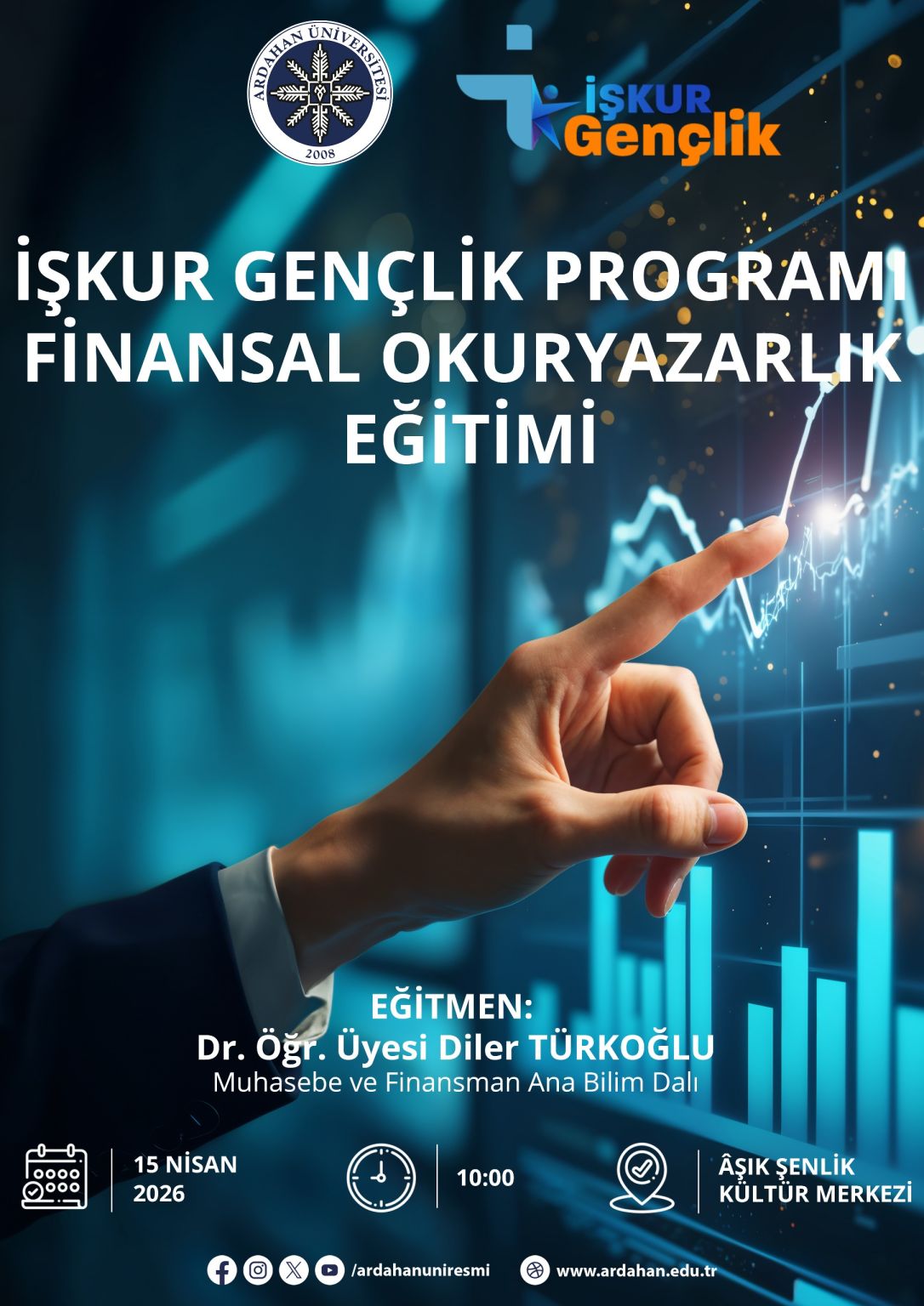 Ardahan Üniversitesi'nde, İŞKUR Gençlik Programı kapsamında öğrencilerin finansal bilinç düzeyini artırmak amacıyla “Finansal Okuryazarlık” eğitimi düzenlendi. İktisadi ve İdari Bilimler Fakültesi İşletme Bölümü öğretim üyesi Dr. Öğretim Üyesi Diler Türkoğlu tarafından verilen eğitimde, bireylerin günlük yaşamlarında karşılaştıkları finansal kararları daha bilinçli şekilde alabilmelerine yönelik önemli bilgiler paylaşıldı.