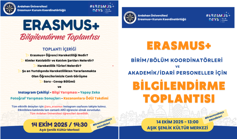 Üniversitemiz Erasmus+ Kurum Koordinatörlüğü tarafından, 2025 vizyonu ve 2025-2026 hareketlilik dönemi (öğrenim, staj, ders verme, eğitim alma) hakkında bilgilendirme toplantıları düzenlenecektir.